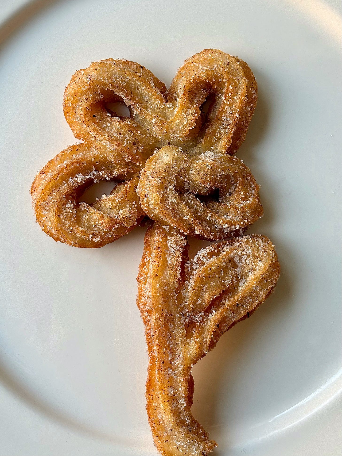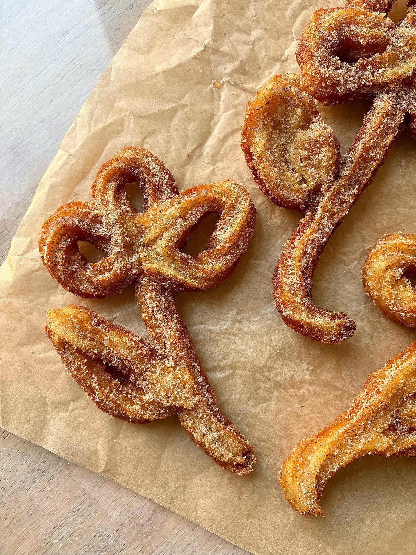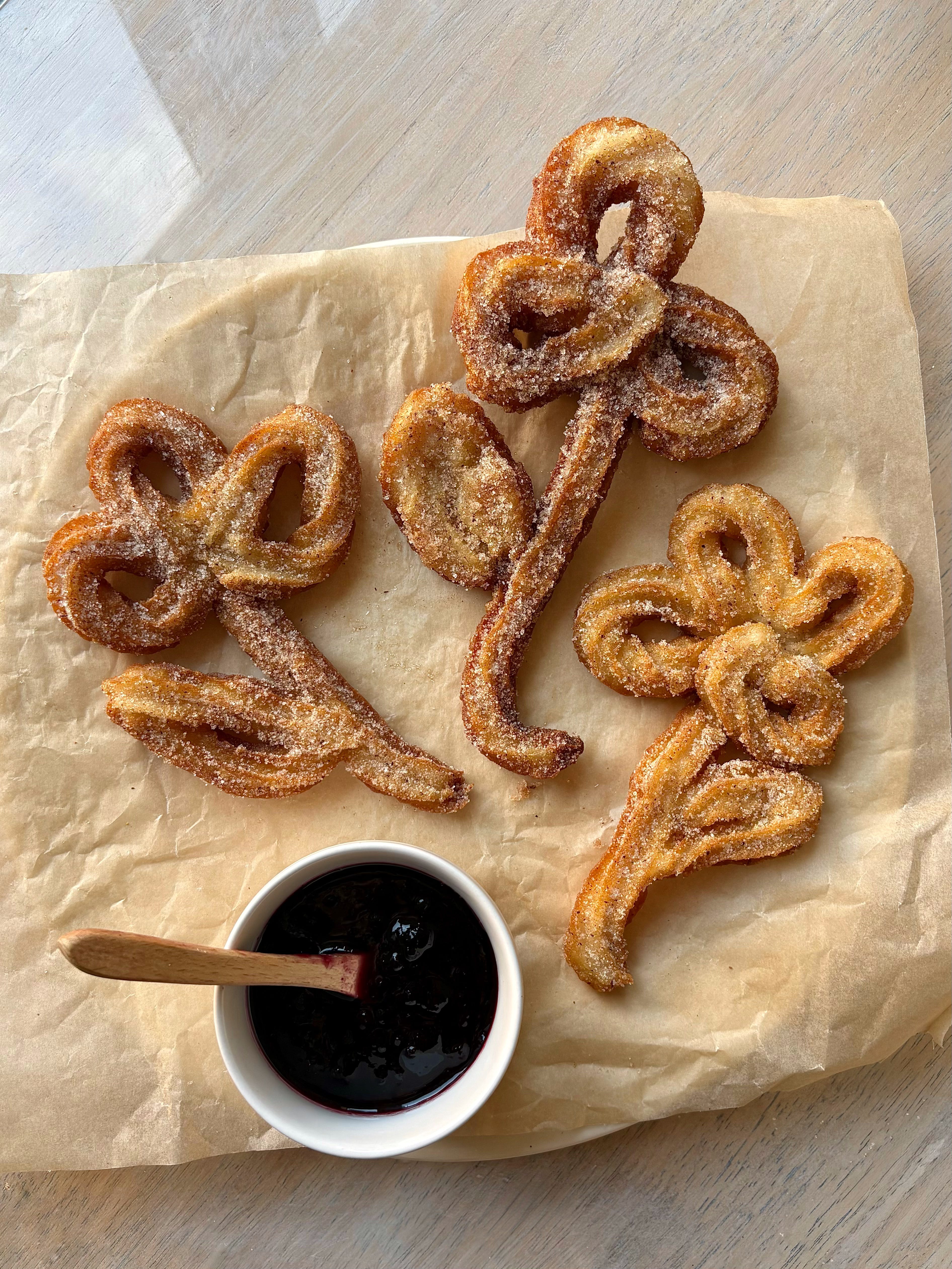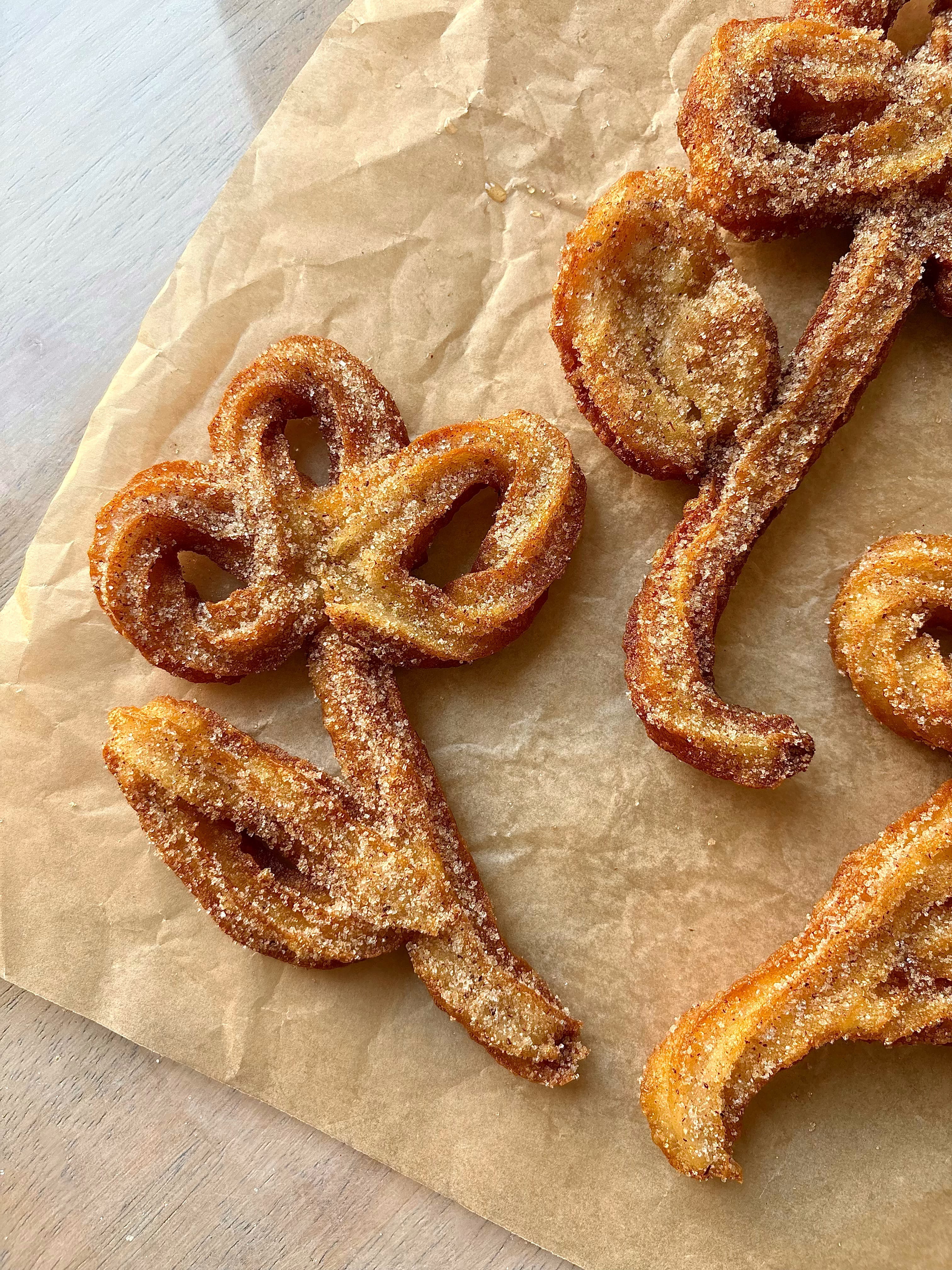 Feel free to have fun and experiment with your churro shape! Just ensure that you don’t pipe the design too tightly, since they puff slightly whilst frying. Also avoid making them too thick (maximum two-layers only on certain areas is best) otherwise the centre will be doughy.