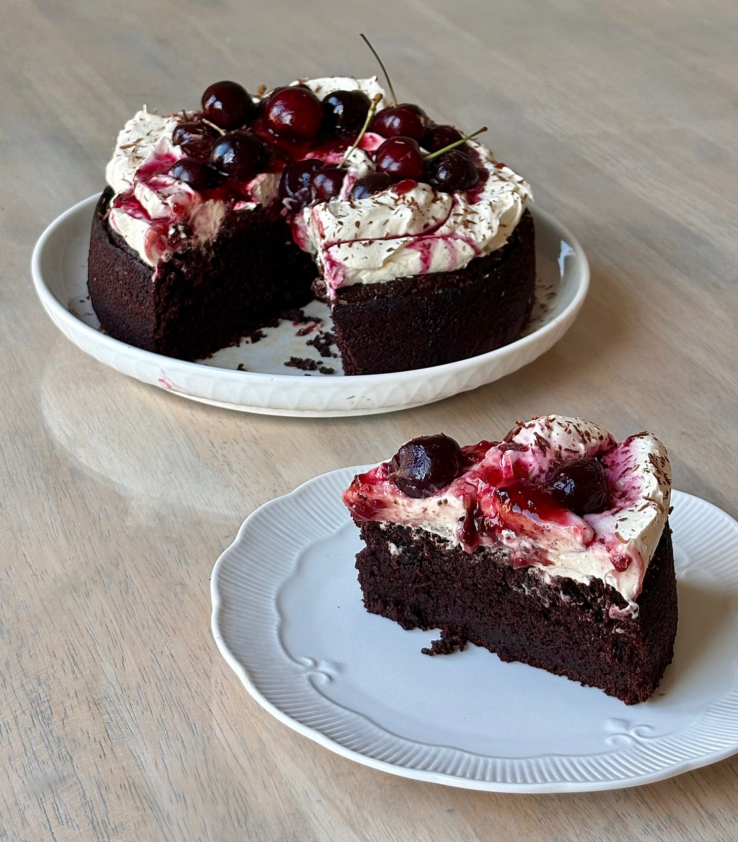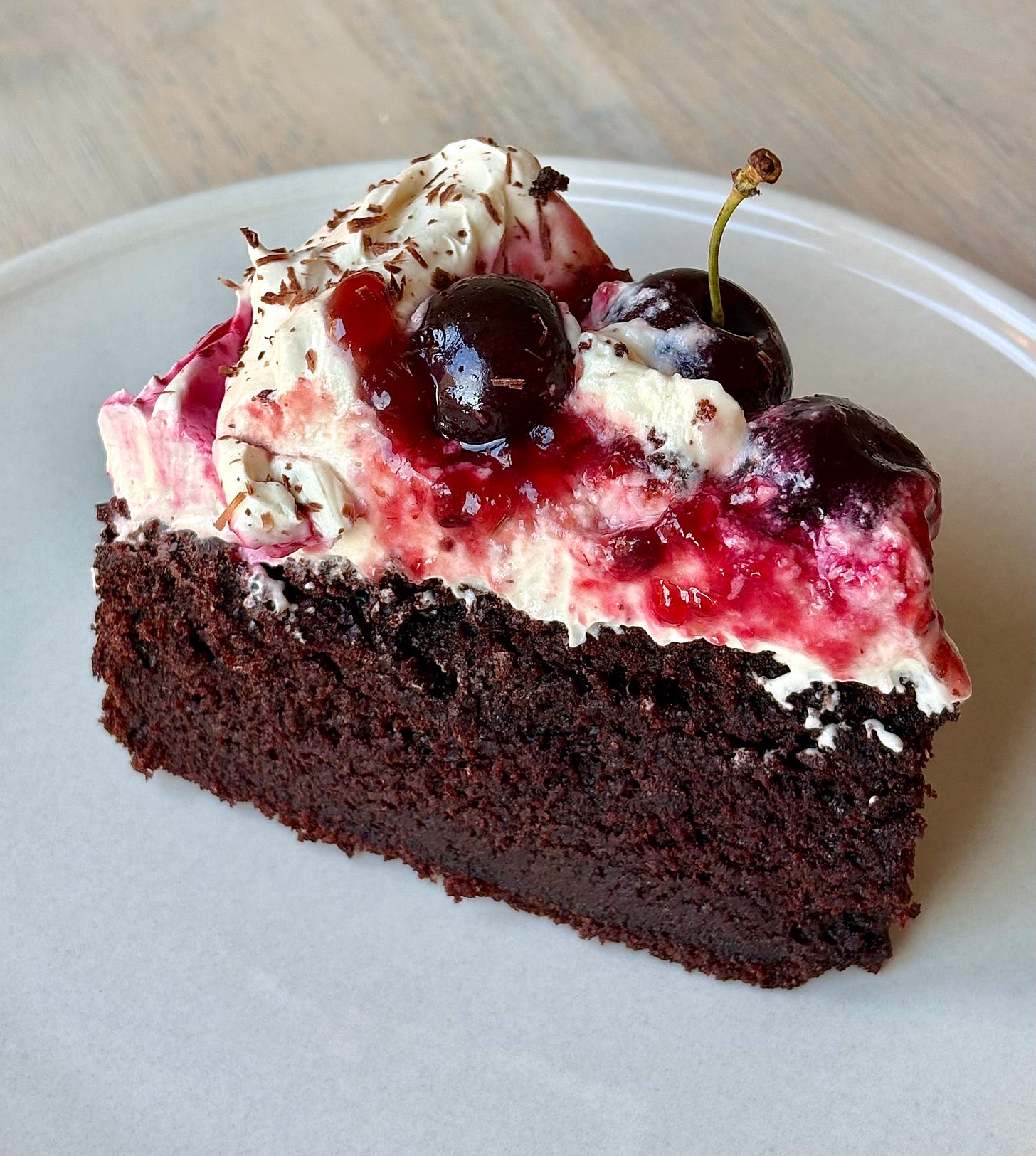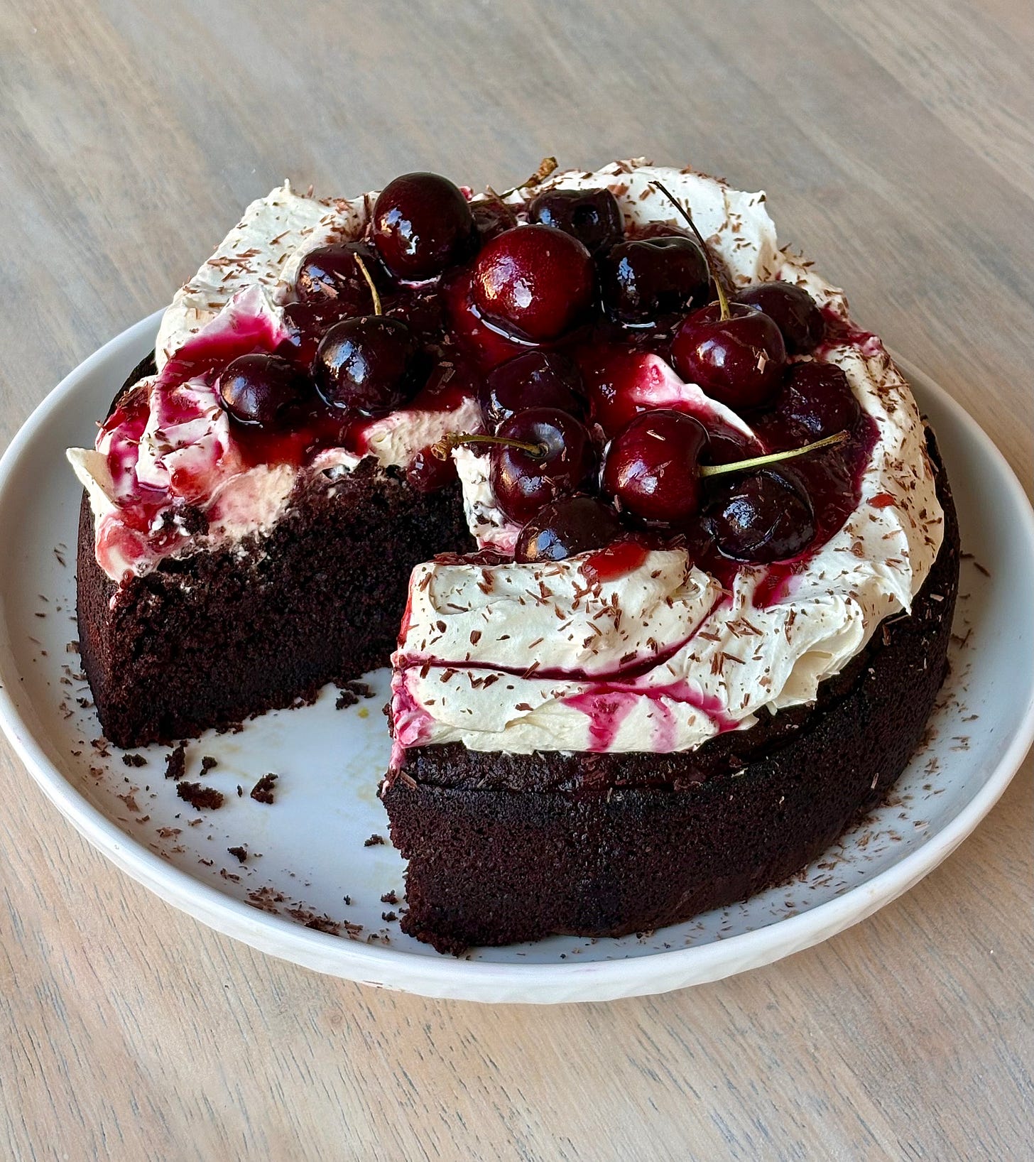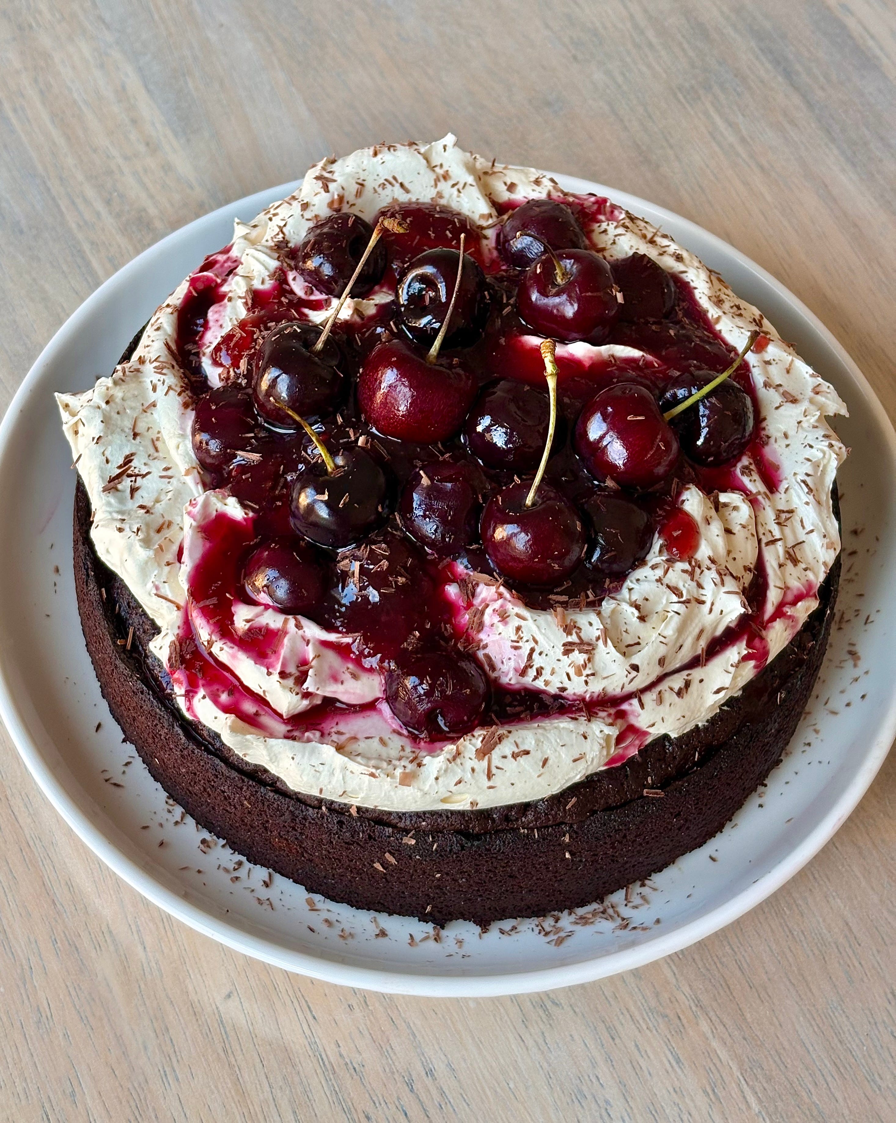 Spread the whipped cream onto the cooled cake, top with the cherry compote, extra fresh cherries if you desire, and a sprinkle of chocolate shavings! (Use a vegetable peeler and a chocolate bar to make your own chocolate shavings)