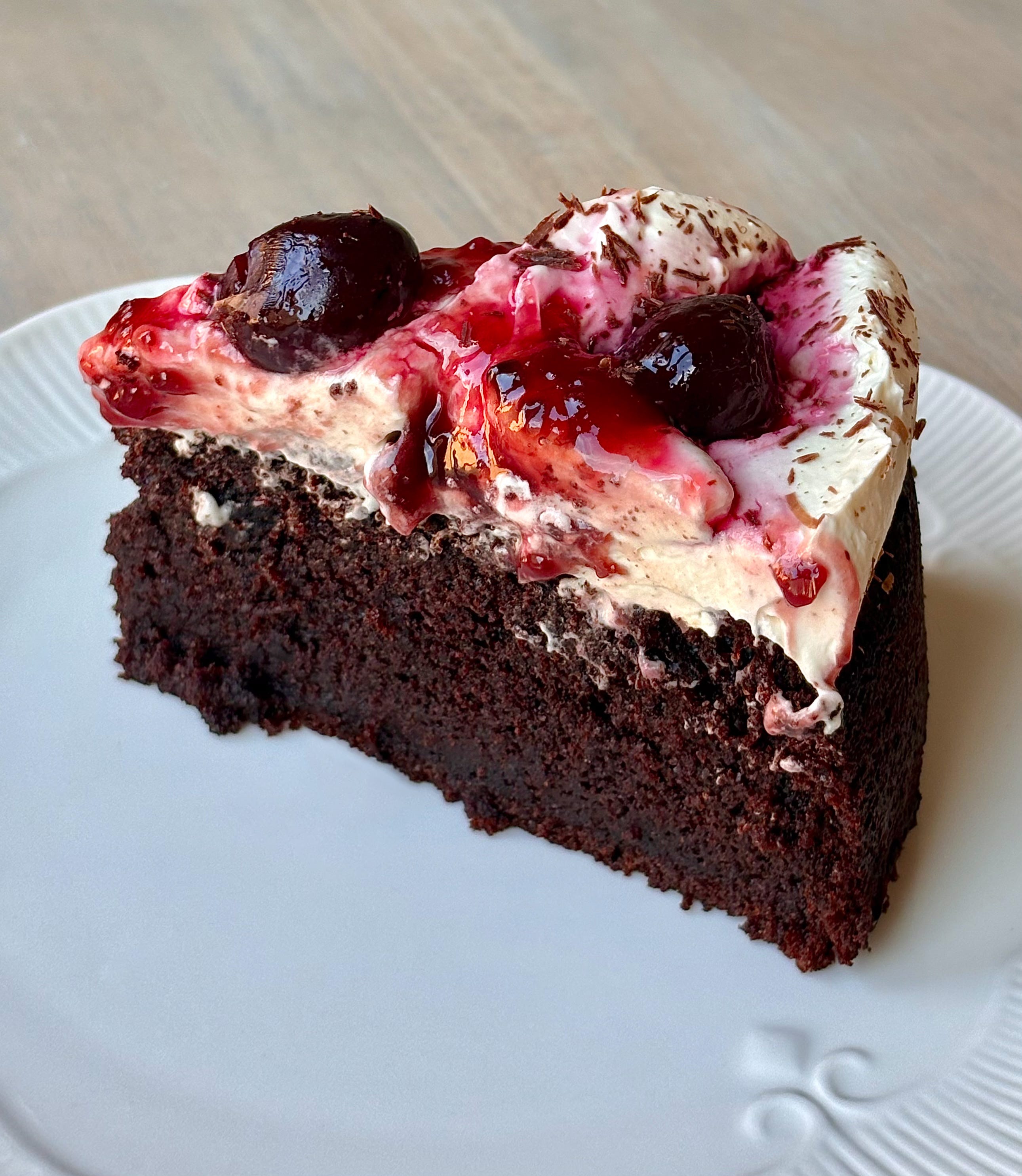 Moist chocolate sponge, pillowy whipped cream and naturally sweet cherry compote. Perfect cake for the winter season...